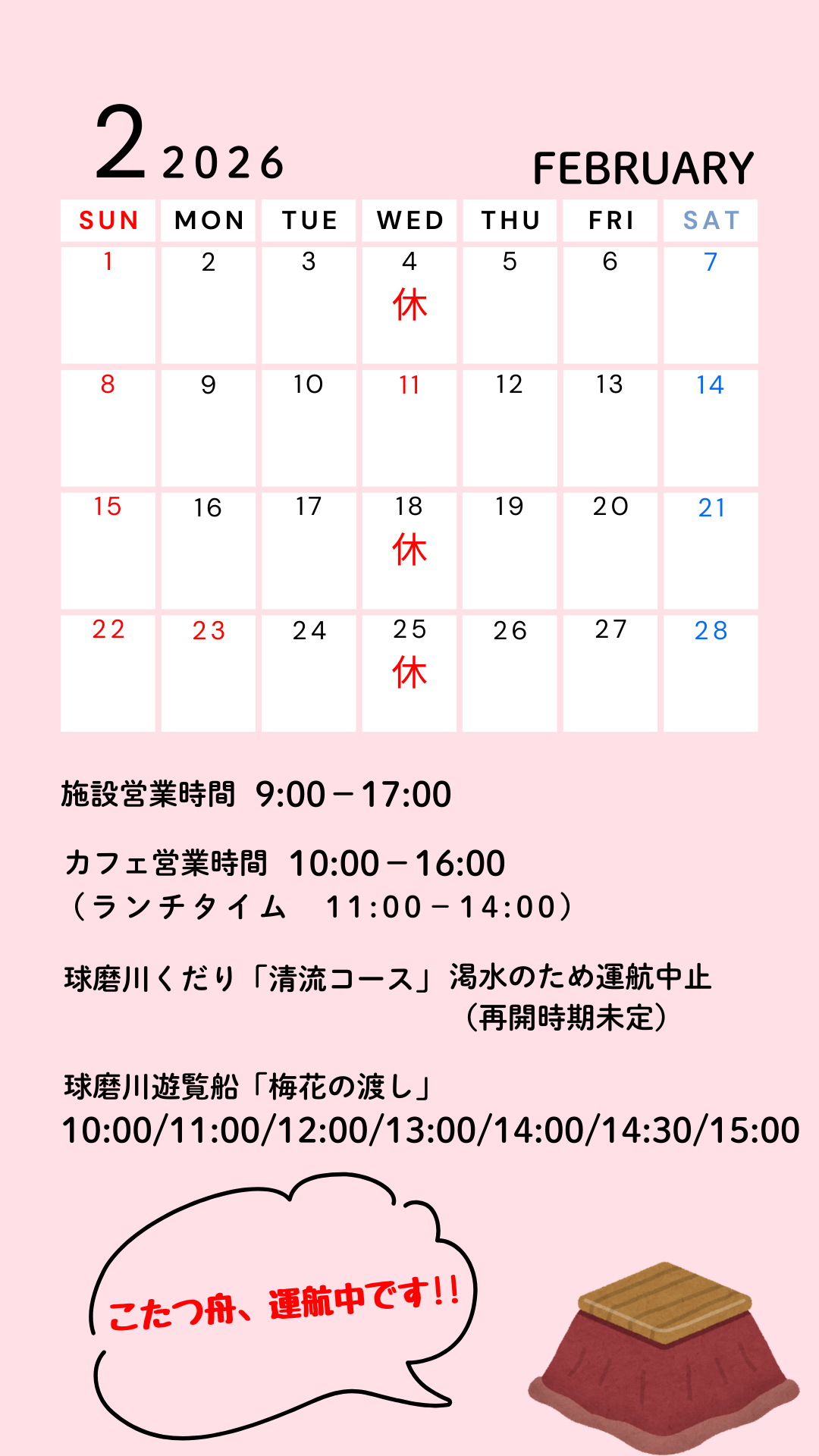 2月は、11日を除く毎週水曜日が定休日です。