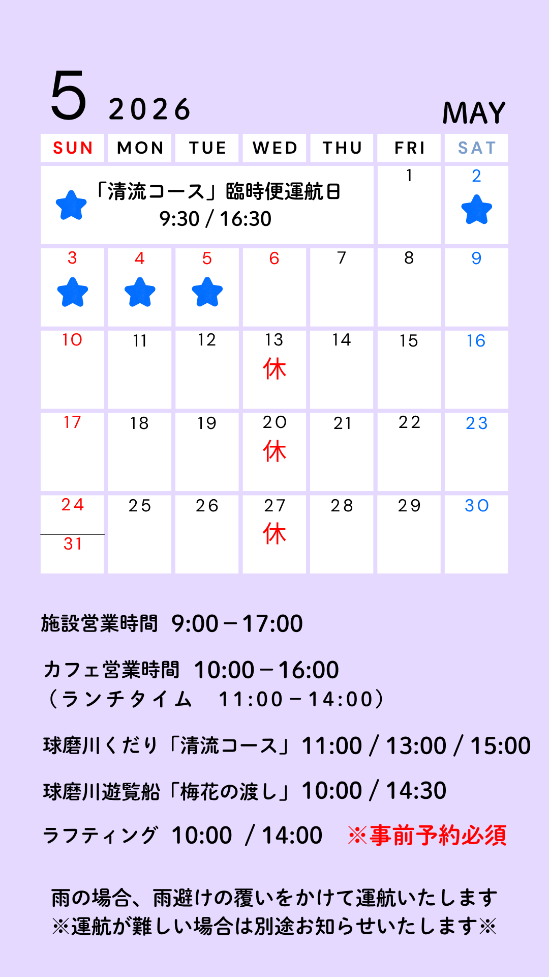 また、ゴールデンウィーク期間中の5月2日(土)・5月3日(日)・5月4日(月)・5月5日(火)の4日間は、球磨川くだり「清流コース」の臨時便を運航いたします。臨時便は9:30および16:30の出発となります。
